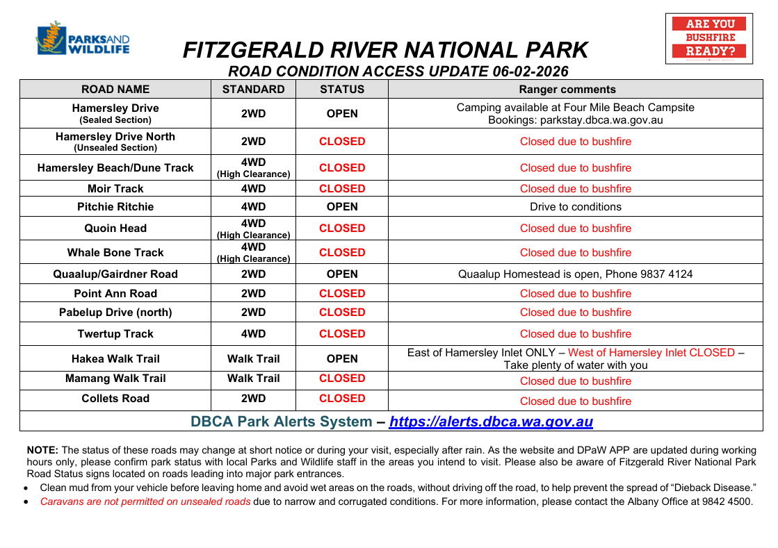 DBCA Park Alerts page to find out which sites have been affected or contact DBCA's Albany Regional office directly on (08) 9842 4500 or email