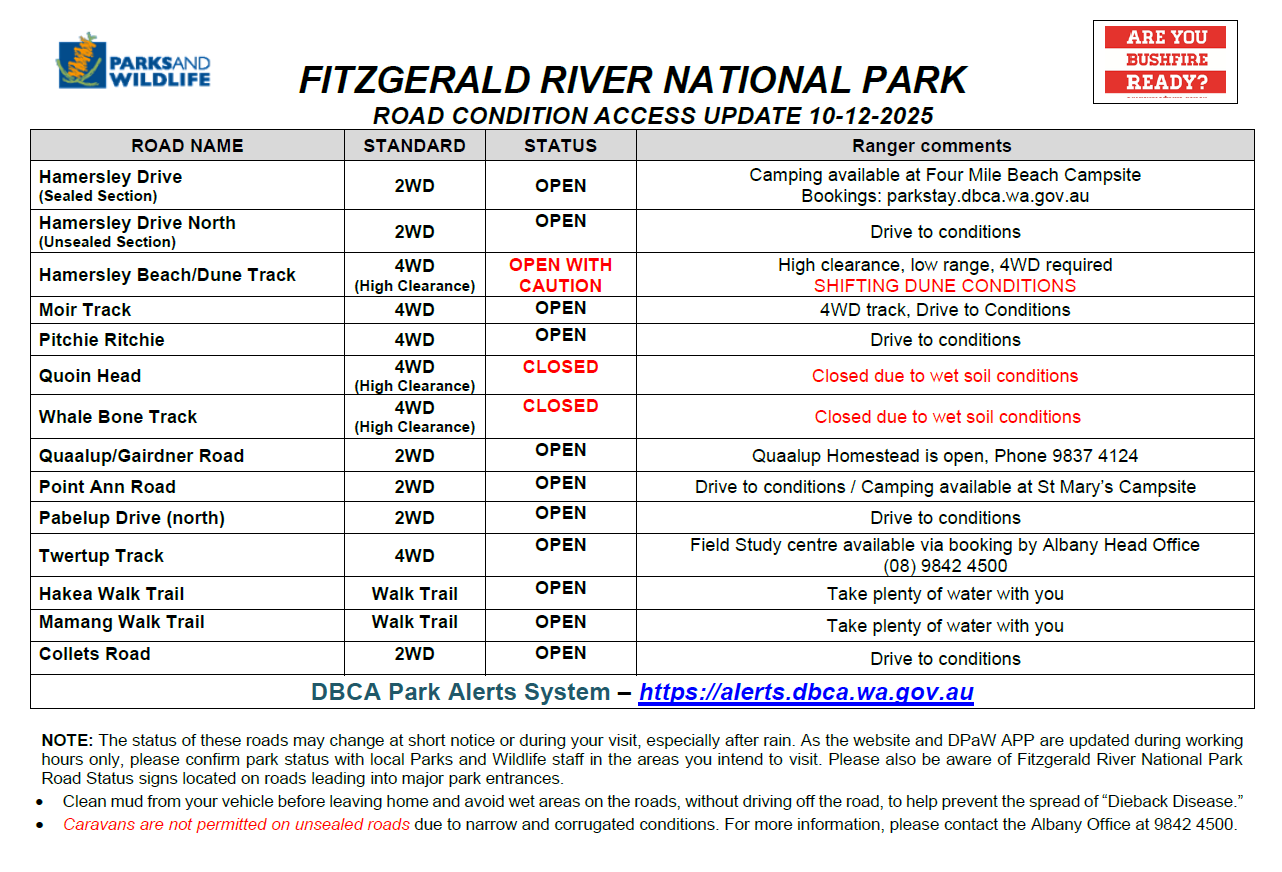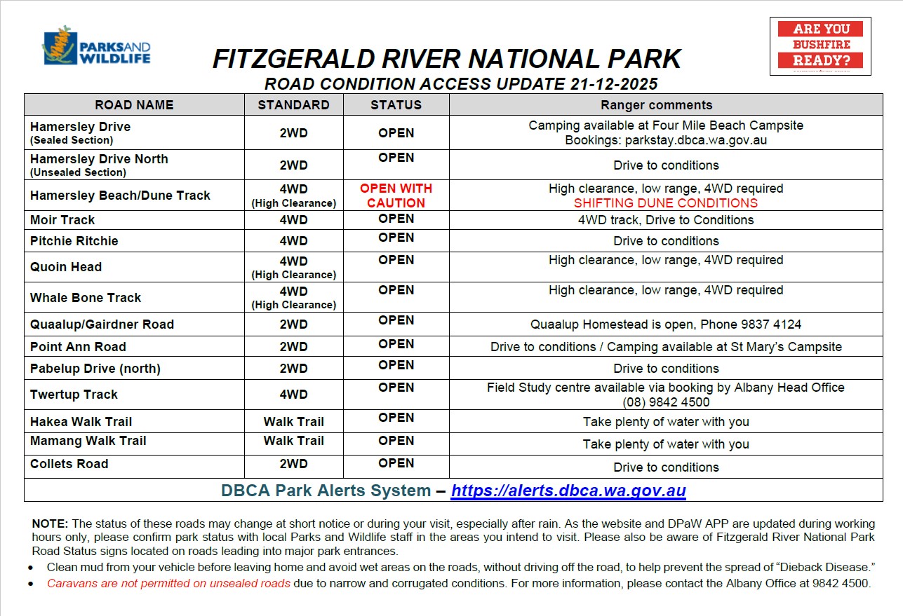 Updates on these roads can be found by contacting the Albany Parks and Wildlife Service on (08) 9842 4500 or by visiting the Park Alerts System https://alerts.dbca.wa.gov.au/